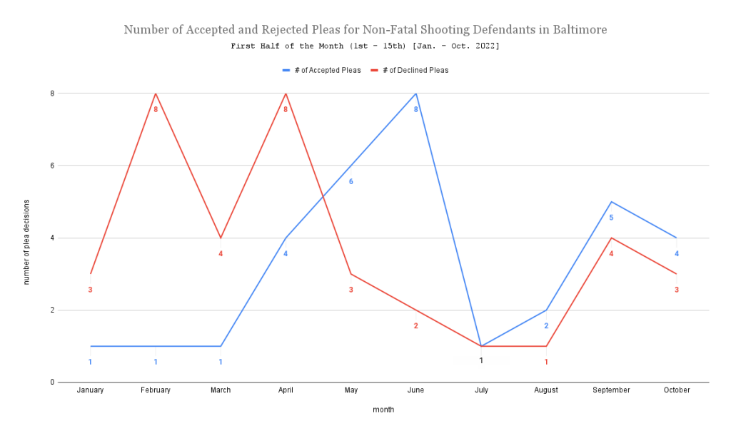 Baltimore Witness data shows, according to the first half of each month from January to October that more plea offers have been rejected by non-fatal shooting defendants.