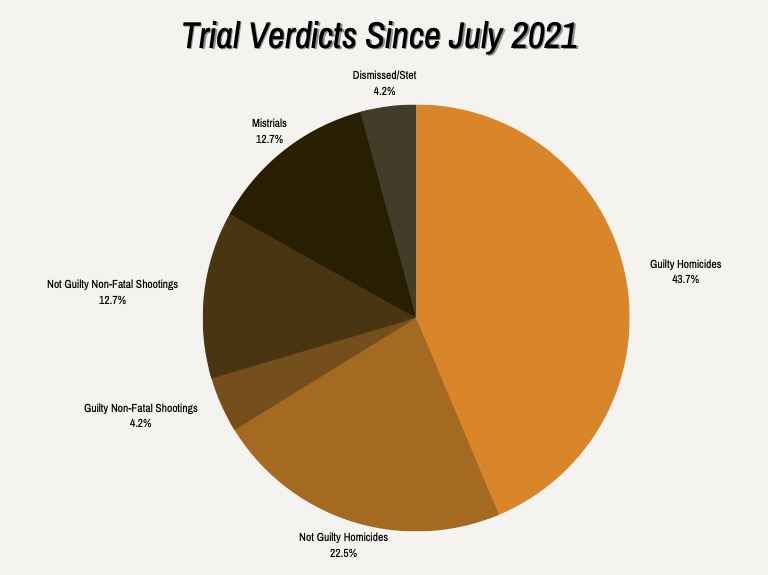The majority of trials were for homicide with 31 guilty verdicts and 16 not guilty verdicts. Baltimore Witness reported 12 total non-fatal shooting trials, consisting of three guilty verdicts and nine not guilty verdicts.