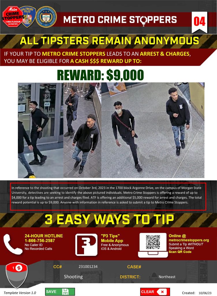In reference to the shooting that occurred on Oct. 3 on the campus of Morgan State University, detectives have obtained additional photos and need your help identifying the persons seen in these photos.