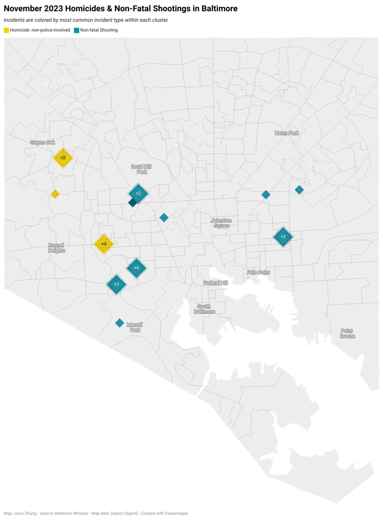 Baltimore Witness data sourced from Baltimore Police Department (BPD) press releases showed almost no change from October’s numbers in non-fatal shootings and homicides. November brought one less incident in each category, but the violence was more geographically concentrated than it had been in October.
