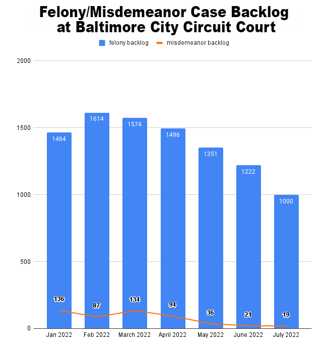 The Baltimore City Circuit Court’s backlog of felony cases dropped 18 percent in June, clearing 222 cases.
