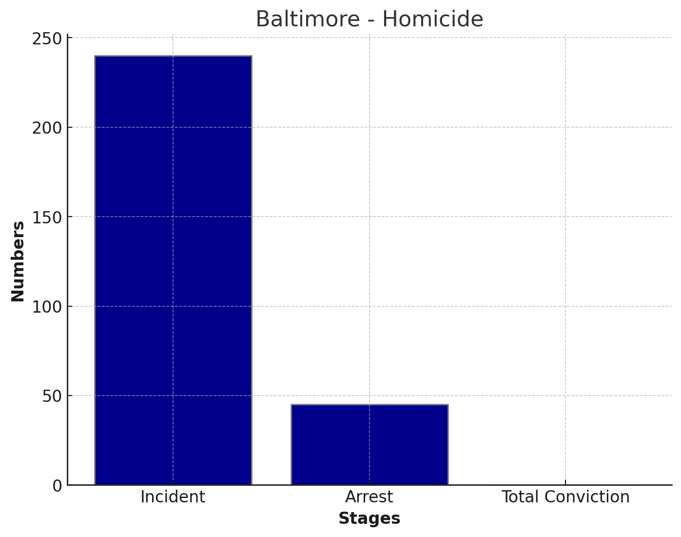 The chart above shows the speed of our court system in 2023. Though the Baltimore Police Department reported 240 incidents of homicides, they only made 45 arrests related to those incidents within the year. For the homicide cases that progressed to Baltimore City Circuit Court, there were zero convictions or guilty pleas.