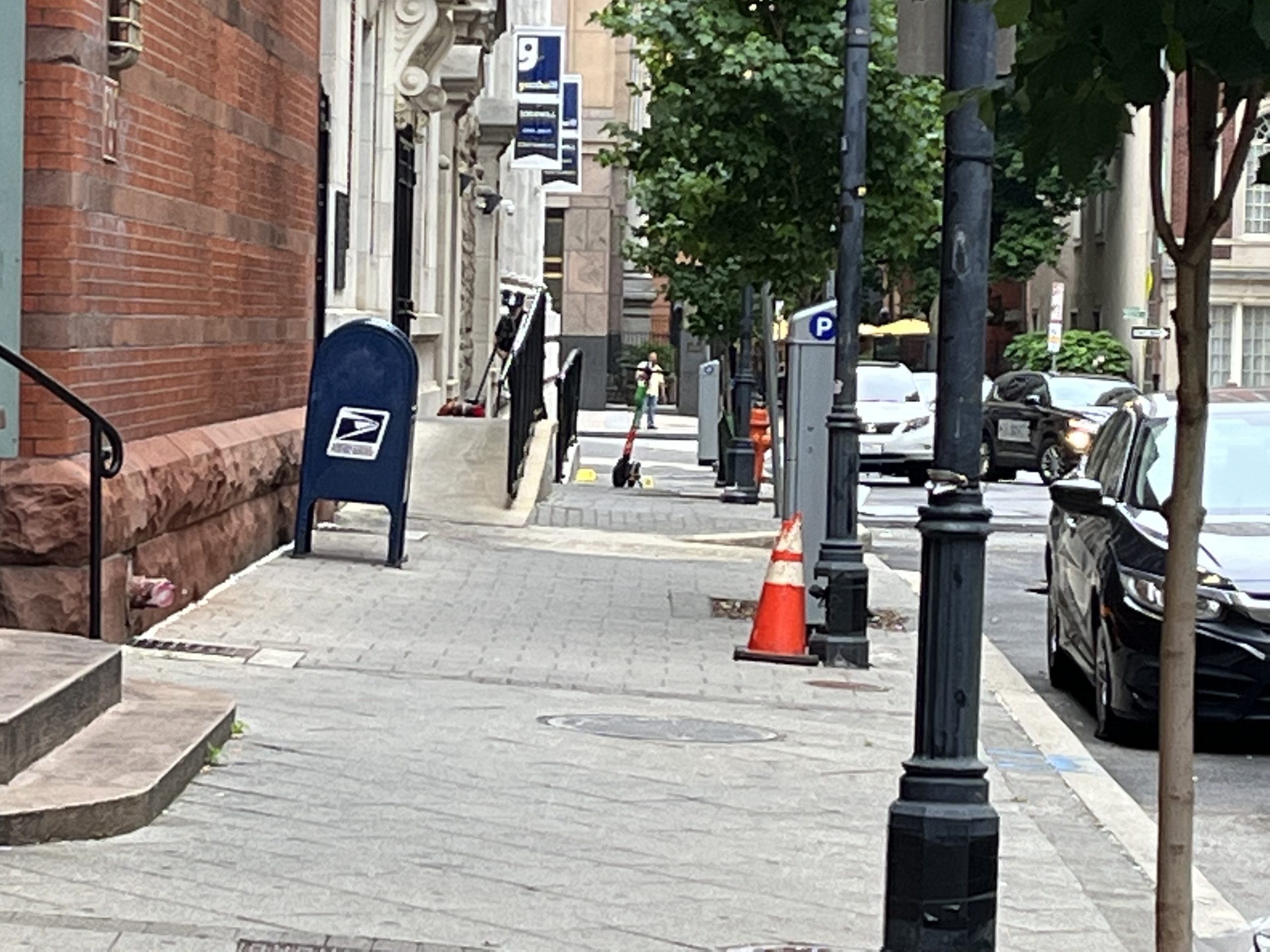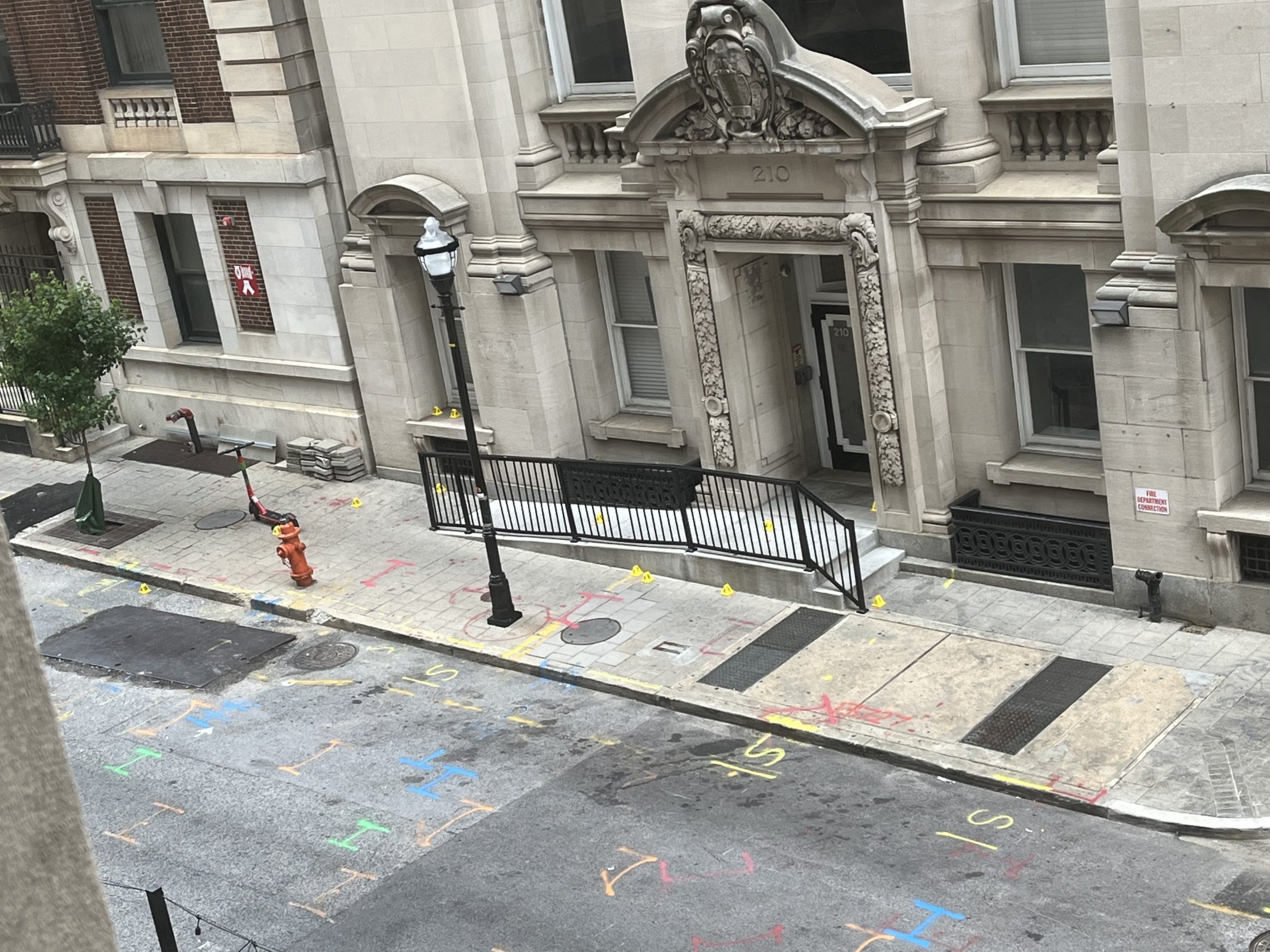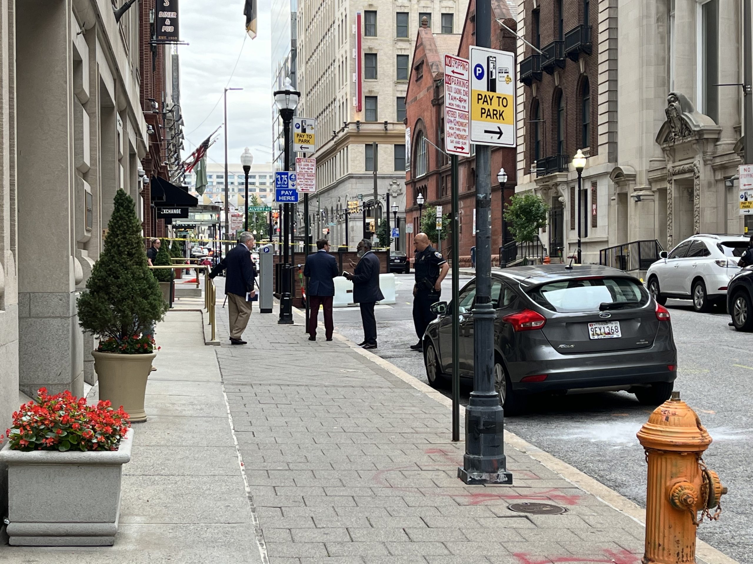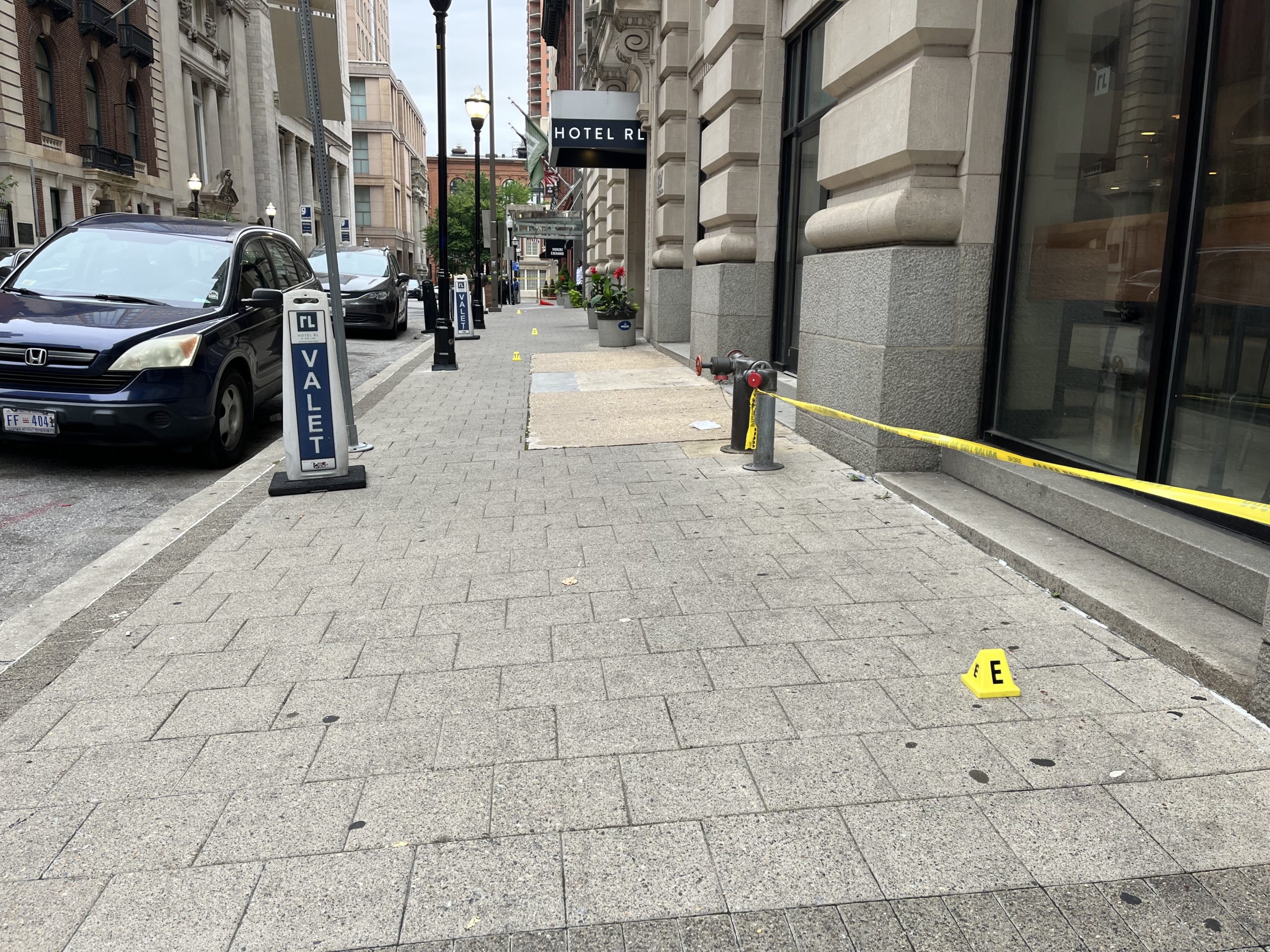 Around 7:45 a.m., crime lab technicians continued to process the crime scene and evidence, which included two electric scooters and a trail of blood that was tracked from the middle of E. Redwood Street up to Hotel RL on the corner of Calvert Street.