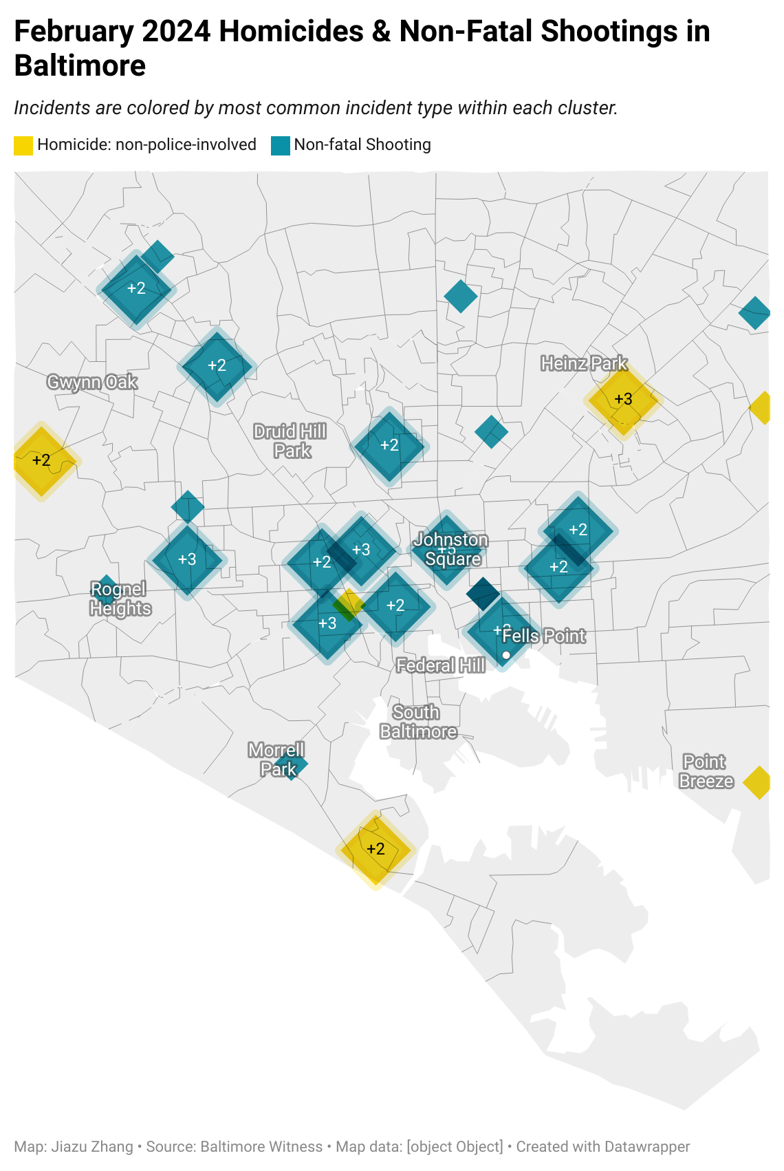 Baltimore Witness counts the Feb. 13 incident that injured four as four discrete shootings, meaning it accounts for nearly half of this month’s number.