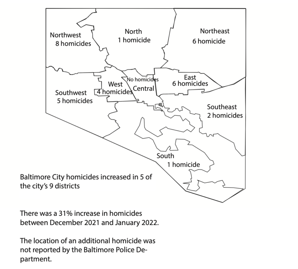 The Baltimore City homicide count increased by 31 percent between December 2021 and January 2022, rising from 26 to 34 homicides, according to Baltimore Witness data. The Baltimore Police Department also reported an additional two deaths as homicides last month, stemming from incidents that occurred years prior.