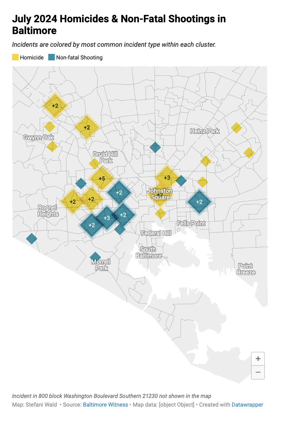 July brought both record-breaking highs and lows of violent crime to Baltimore. The city experienced the highest number of homicides per month and the lowest number of non-fatal shootings per month of 2024 so far in July.