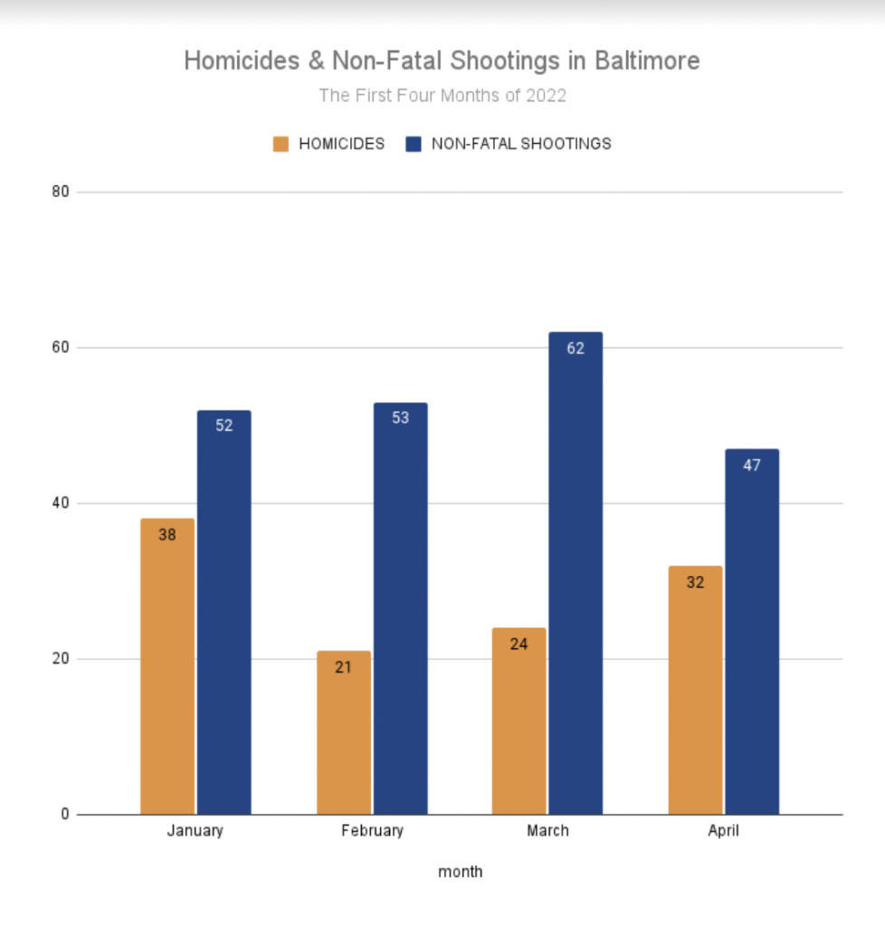 Non-fatal Shootings Decline while Homicides Rise in April May 3, 2022 — Baltimore Witness staff Data Features The number of homicides in Baltimore City steadily increased from January through March only to decline in April.