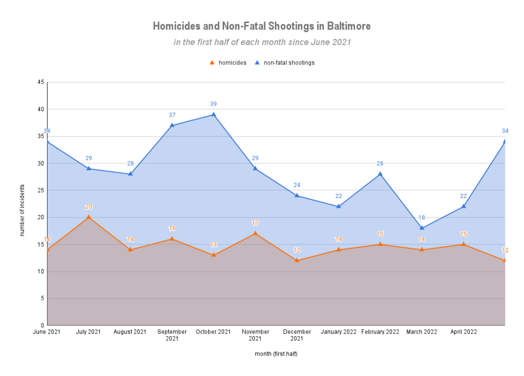 From May 1 to May 16, Baltimore Witness has recorded approximately 34 non-fatal shootings, surpassing the 22 non-fatal shootings recorded in April.