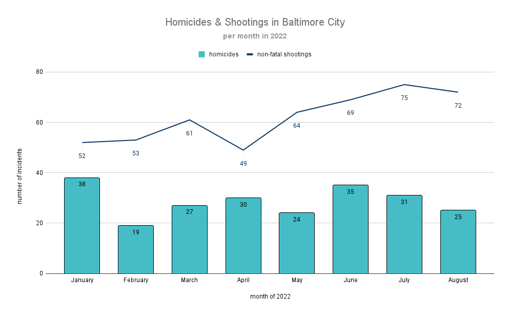 The Number of Homicides and Non-Fatal Shootings Throughout the Last 8 Months August 31, 2022 — Alyssia Davis Data Features The graph shows the rate of homicides and non-fatal shootings over the last eight months.